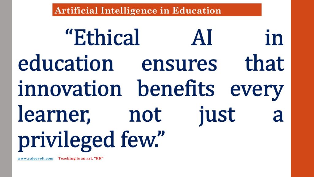 “The true power of AI in education lies not in automation, but in personalization.” We should also consider the ethical concerns associated with AI in education. Data privacy is one of the most pressing issues, as AI systems rely heavily on student data to function effectively. The collection, storage, and use of personal information raise questions about consent, security, and ownership. If not properly regulated, these systems could expose sensitive data to misuse or breaches. Algorithmic bias presents a significant challenge. AI systems trained on biased datasets may produce unfair outcomes, potentially disadvantaging certain groups of students. We must therefore ensure that AI systems are transparent, accountable, and designed with fairness in mind.