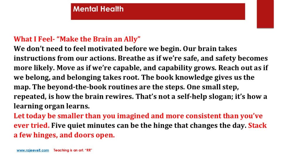 We don’t need to feel motivated before we begin. Our brain takes instructions from our actions. Breathe as if we’re safe, and safety becomes more likely. Move as if we’re capable, and capability grows. Reach out as if we belong, and belonging takes root. The book knowledge gives us the map. The beyond-the-book routines are the steps. One small step, repeated, is how the brain rewires. That’s not a self-help slogan; it’s how a learning organ learns.